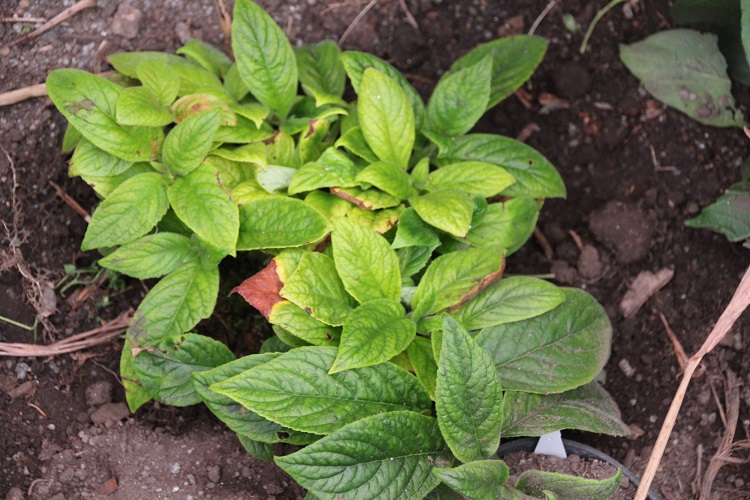 too rapidly and I had to move it back to the greenhouse where it is growing in light shade with the Aspidistra. Much easier to keep moist, which is said to be the secret in getting it to flower. The Edrom label says: "A rhizomatous gesneriad which has fleshy green/purple leaves and attractive yellow/orange foxglove-like flowers in late summer. Needs summer moisture." Plant Delights Nursery say: "Titanotrichum oldhamii is an amazingly hardy African violet relative, originally shared in 2002 by our friend, Georgia gardener Ozzie Johnson. After growing this Asian gesneriad in the garden, it was great to finally see it growing wild in Taiwan in 2008, where it clung to nearly vertical rock cliffs. The fuzzy basal leaves make a nice small clump to 12" wide which, in September and October, is topped with 1' spikes of dramatic, golden yellow bells with vivid, cinnamon-red centers. One look at a flowering Titanotrichum oldhamii will bring you to your knees faster than a passing pope...we promise! Titanotrichum oldhamii has survived 0 degrees F in our garden with good winter drainage." |