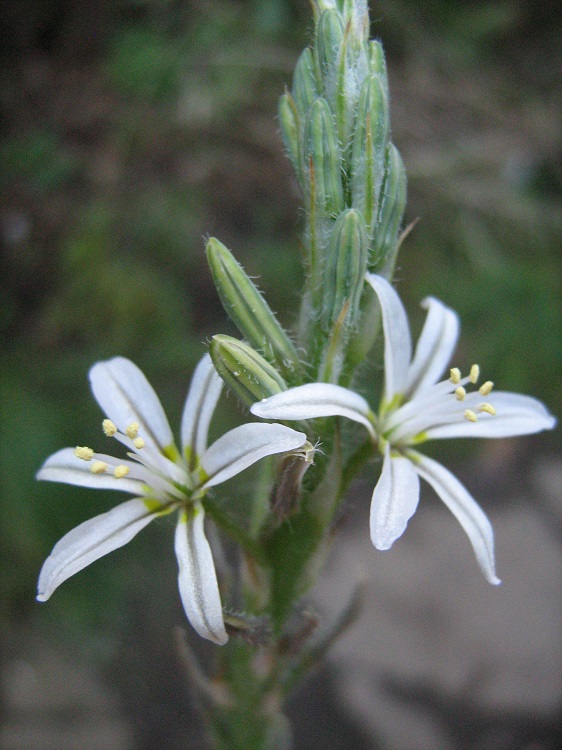 my single flowering stem wouldn't have made much of a mouthful. I got it from Tale Valley Nursery, their label says: "Low growing South African perennial with stalks of white starry flowers. Well drained compost in cool greenhouse. Seed raised." Plantzafrica says: "Widespread, usually on coastal sands from southern Namibia to the southeastern Cape. The name Trachyandra is derived from the Greek words, trachy, meaning rough, and andro, meaning male, and refers to the scabrid (hairy) filaments of the stamens. There are ± 55 species that mainly occur in southern Africa, particularly the Western Cape, but some species extend into tropical Africa as far as Somalia. Trachyandra ciliata (ciliatus means finely hairy) is most similar to T. arenicola and T. falcata in the congested inflorescence. It was described by Linnaeus' son from a specimen collected by Carl Thunberg in the 1770s during his expeditions in the Cape. Trachyandra ciliata is common on sandy flats along the southwestern Cape coast. The plants are easily recognized from other similar species by the trailing, snake-like flower spikes. The fruiting stalks curve downwards very characteristically. Like all species in the genus, each flower lasts only a single day and is pleasantly scented. Trachyandra ciliata is used as a vegetable. The flowering stalks are harvested before the flowers open and can be steamed or boiled in much the same way as asparagus, or cooked in a stew. Its use as a vegetable seems only to have been first recorded as recently as 1915 by Rudolph Marloth." |