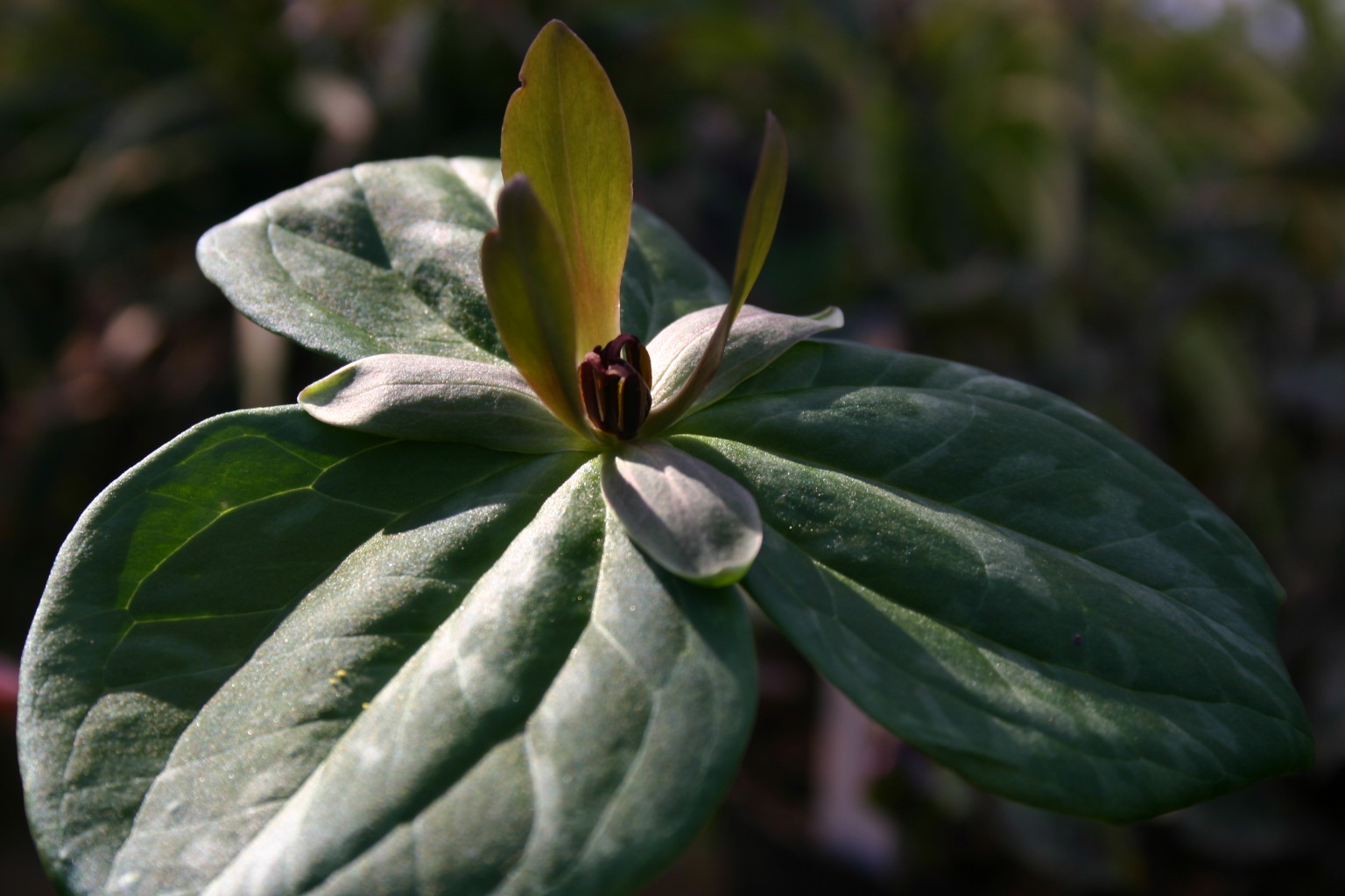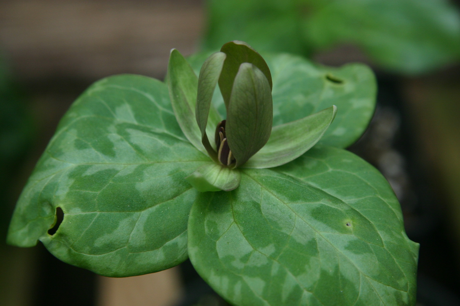 This one came as a prepacked rhizome from a garden centre. Writing in 'The Plantsman' in 1989, Robert J. Mitchell says: Distribution. North Carolina to Kentucky, south to Mississippi and Alabama. Trillium cuneatum is regarded by some authors as synonym of Trillium hugeri. Others link T. hugeri with T. viride or place it as a synonym of T. cuneatum. Recent opinion cites T. cuneatum as the correct name with T. hugeri in synonymy. This tall species grows in neutral to calcareous soils in mixed wodland, but it is also found on a variety of soils derived from granite, and in sandy alluvium. It shares a similar distribution with T. luteum and overlaps into the range of T. maculatum, but has a wider distribution than any member of the 'Maculatum Group'." Case and Case say: "This largest of eastern sessile trilliums grows over almost as vast an area as any eastern sessile species. As one would expect, with so large a range, many forms, mostly unnamed, occur. Trillium cuneatum is most magnificent carpeting the forest floor over Ordovician limestone or shale bluffs in southern Kentucky, wooded hillsides in south-central Tennessee, and near Huntsville, Alabama. Its large size, rich dark flower, and strongly mottled leaves create an impression not to be forgotten." |