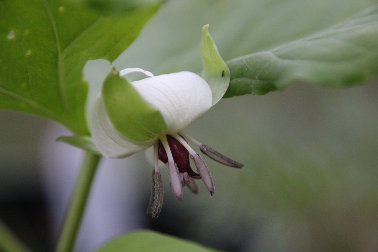 A large growing species with creamy flowers on a distinct pedicel. Paul Christian's 'Rare Plants' catalogue says: "A relative of cernuum with broad diamond-shaped leaves and a thickly-textured, broad-petalled, white, hanging turkscap flower each with a maroon nose, this colouration spreading into the centre of the flower." Writing in 'The Plantsman' in 1990, Robert Mitchell says: "The plant was first found by Rugel in 1841 in North Carolina and this specimen, at the British Museum (Natural History), is the type specimen. Barksdale (1937) located colonies of this species in the type locality, finding them to have fairly constant features, but varying greatly in plant size. It grows in slightly acid neutral soils in moist woodlands near to streams or in rich soils above the flood plain. In cultivation it is frequently confused with Trillium cernuum and, like this species, it is relatively easy to grow." |