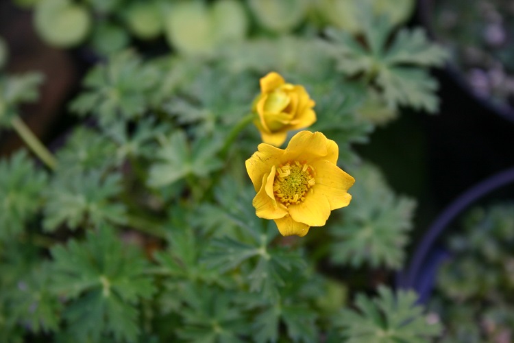 A vigorous dwarf species from China and the Himalayas. My plant comes from the collection ACE.1818 (Alpine Garden Society expetition to China, 1994). The Alpine Garden Society online encyclopedia says: "Height to 30cm Leaves mostly basal, l-5cm wide, five to seven lobed, each lobe tripartite, broadly ovate. Flowers solitary, yellow, 2- 4cm wide, opening flat. Sepals five to six, rounded, petals ten to twelve, narrowly wedge-shaped, slightly shorter than the sepals but the same length as the stamens. Uttar Pradesh to south-western China, on open slopes." Writing about the ACE collection in the Bulletin of the AGS, John and Hilary Birks say: "T. pumilus formed extensive stands of brilliant yellow. brightening up hillsides between 3100 and 3800m on the Sichuam Plateau." |