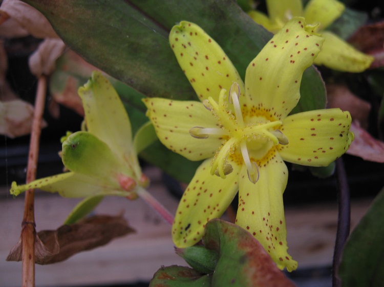 A good, dwarf, yellow flowered species from Japan with compact growth and large flowers. Plants of the World online says: "The native range of this species is Japan (Kyushu: Miyazaki Pref.). It is a perennial and grows primarily in the temperate biome." Plant Delights say: "Tricyrtis flava is a rare "vulnerable" Japanese endemic toad lily species that is without a doubt one of the finest members of the genus, and certainly one of the least known. The foliage emerges in spring with dramatic dark purple spotting, that soon ages to dark green, before disappearing in the heat of summer. In early fall, the short, compact clumps are topped with clusters of quarter-sized clear yellow, upward-facing flowers, each held above the foliage by a 4" stem. A mass of Tricyrtis flava in the woodland garden is just like a bowl of good ice cream.... indescribable!" |