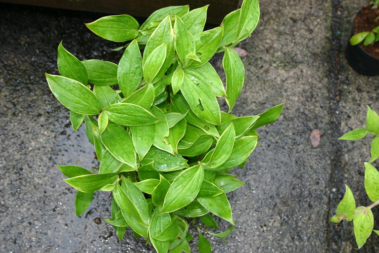 A form with thin yellow margins to the leaves, and rather pale lilac purple tinged flowers. There