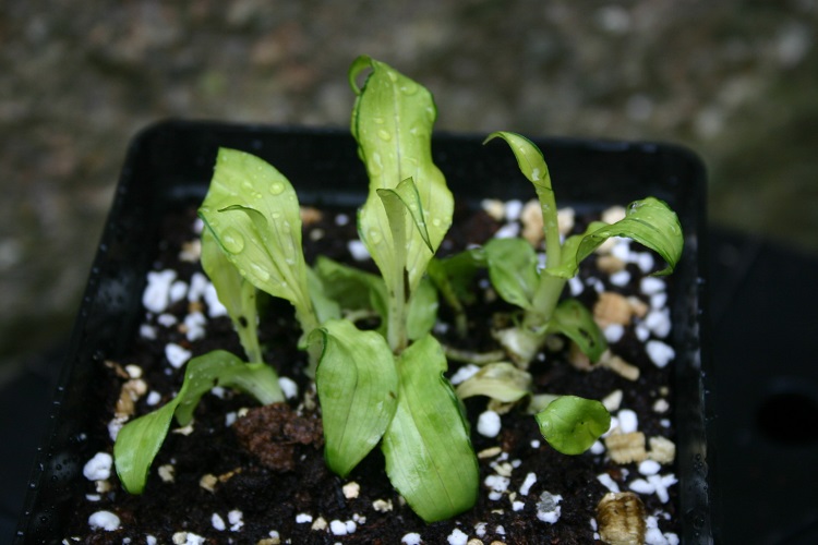 The broad gold foliage has a thin dark green marking. The leaves are hairless (T.hirta var masamunei technically). The white are spotted with blue purple,