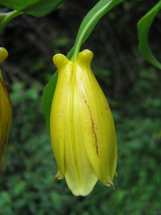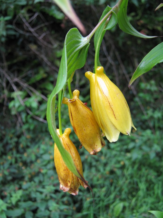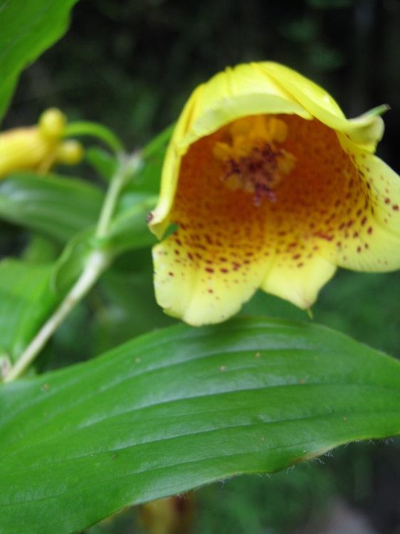 which is rare in cultivation. Bright glossy leaves on long arching stems. Plants of the World online says: "The native range of this species is Central Japan (Kii Peninsula). It is a perennial and grows primarily in the temperate biome." Writing in the JRHS in 1982, Roy Lancaster says: "At the Great Autumn Show on 23rd September 1980, however, an Award of Merit was given to the Japanese T. macranthopsis, a very different 'kettle of fish' from the normal run. In fact, by coincidence two plants were submitted for award, one by Mr. B. Mathew of Weybridge, Surrey, and another by Mrs K. N. Dryden of Sawbridgeworth, Hertfordshire. Grown in pots the plants had slender brownish ghreen arching shoots to 12in. long (30cm) bearing handsomely ribbed, lance-shaped leaves to 3 to 3 1/2in. long (8cm), clasping the shoot at their base. The pendulous bell shaped flowers 1 3/4 to 2in. long (5cm) were borne singly on slender stalks from the leaf axils. The three outer segments were recurved at the tip with a horn-like point and posessed a pouched nectary at the base. In colour they were lemon-rind yellow beautifully spotted red within. It seemed to me from the habit of the plants exhibited that it would grow naturally and look most at home on a woodland bank and I was interested to note that the growers recommended it for a semi-shady soil on the shady rock garden or for the alpine house. In the wild T. macranthopsis is found on shade cliff faces and this should be borne in mind when siting it in the garden." |