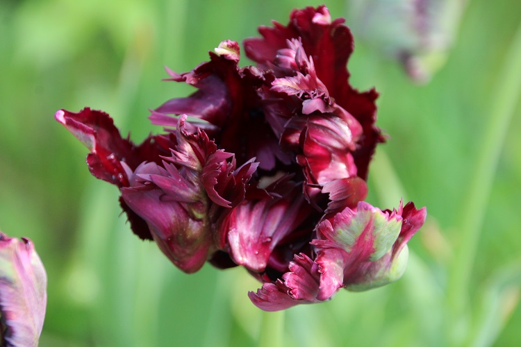 A spectacular dark flowered cultivar. I bought them from a garden centre and grew them for a year for effect. Registered by K.Keur and sons in 1937, the KAVB register says: "Exterior deep purple; inside blackish purple." J. Parkers say: "This deeply coloured cultivar boasts large, flared heads with intricately feathered edges. Each petal twists and turns artistically, boasting a rich and velvety black. Tulip Black Parrot is hard to ignore and sure to impress through spring. Each flower head sits on a tall sturdy stem, surrounded by lance-shaped foliage. Tulips like to be planted late in October and November with the colder weather." |