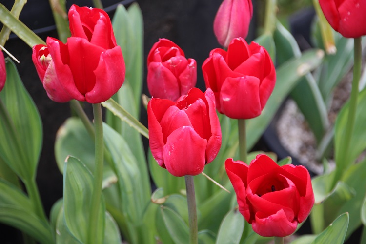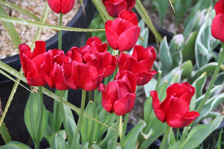 Never let me loose among the bargain bins at the end of the bulb season! A very bright, dwarf cultivar registered by G. Groot-Vriend in 2004. The KAVB regisater says: "Color summary: red 34A, red N30A edged. Variegated leaves. Inside: bottom dark brown 200A on sides slightly yellow-orange 13A. Petal red N30A. Anthers fused to bl.bl. Pollen yellow 9A. Style yellow-green 1C slightly anthocyanin at edges. Stamp yellow-green 1B. Exterior: basic yellow-orange 13B. Petal red 34A at edges red N30A. Stem light green with hint of anthocyanin. Leaves medium green with anthocyanin stripes." Farmer Gracy says: "Are you in love with tulips? Even if you’ve never been much of a fan, you’ll fall in love with this romantic beauty. The passionate red blooms alone would be reason enough, but Tulip 'Fire of Love' will enchant you from the moment its leaves begin to spring from the ground. The handsome foliage is highlighted with a pristine white edge, making your tulips a feature long before they begin to bloom. " |