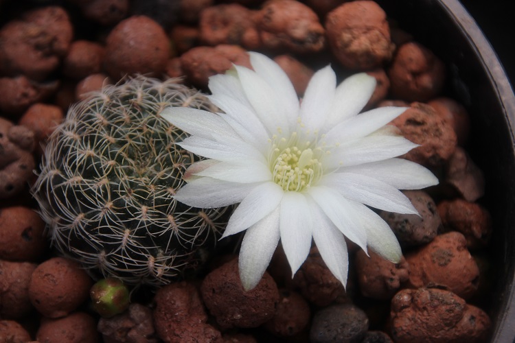 Notwithstanding, it is a very attractive small plant with white flowers. Plants of the World online says (as it does for most of the Weingartia: "The native range of this species is Bolivia. It is a succulent subshrub and grows primarily in the desert or dry shrubland biome." Which just emphasises how similar they all are and how they all grow in the same, rather resticted, habitat. The Llifle encyclopedia says: " Sulcorebutia roberto-vasquezii is found in the Bolivian Department of Chuquisaca, 1300-1400 meters above sea level. This species grows on stony-rocky slopes. Solitary except in case of injury to the growing tip, flattened globular, up to 5 cm tall and 6 to 10 cm across. Buds often numerous greenish to reddish-brownish, borne on the sides or at the base of the stems from older areoles. The flowers are fragrant up to 23-30 mm long and 35-45 mm across. They are often white to creamy, sometimes rose-violet in the outside and white inside (rarely completely rose-violet with salmon shades)." |